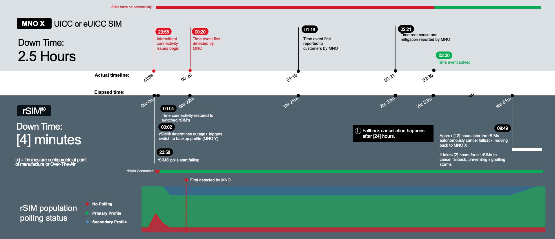 This outage provides a clear view of how connectivity behaves in real-world conditions, and where resilience makes a measurable difference. With the rSIM® network downtime can be reduced from hours to minutes. This example illustrates how a 2.5-hour period of no connectivity on a normal SIM was reduced to minutes using the rSIM®: